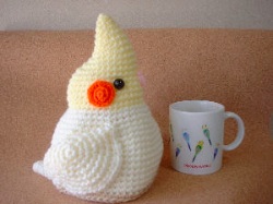 ティーコージーならぬ、マグコージーです。せっかく丁寧にたっぷり淹れた紅茶やコーヒーが冷めるのが嫌で、いつもごくごくせわしなく飲んでいるのに気づいて、「ポットのがあるならカップ用があっても良いのになあ...」と思って作ってみました。オカメが形的に一番適しているようです。高さ約24cm、底が約20cm(尾羽込)とちょっと嵩張りますが...