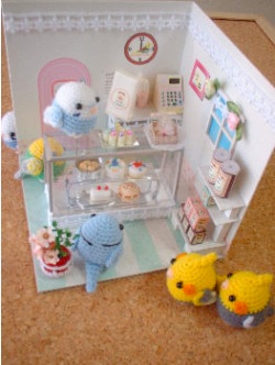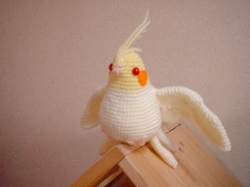 極細毛糸で編むのが細小だと思っていましたが、もう少し小さいものを編んでみることに。けれど、新しいレシピをレース糸用に考えなくては小さくならないということがわかり、苦し紛れに手元にあった手縫い糸で編んでみました。(ということで、普通と同じレシピで編んでいます...このタイプのセキセイは少ない方ですが約1000目)手がつります(笑)。オカメは2号、セキセイは10号針で編みました。